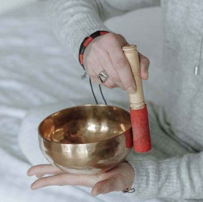 Une personne fait sonner un bol tibétain sur le creux de sa main avec un maillet
